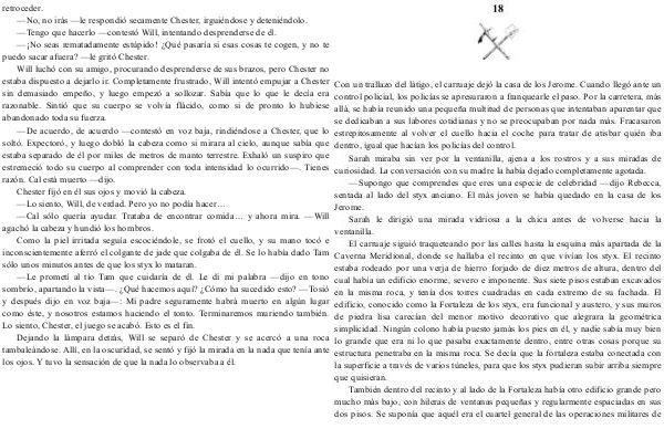 — De acuerdo, de acuerdo— contestó en voz baja, rindiéndose a Chester, que lo soltó. Expectoró, y luego dobló la cabeza como si mirara al cielo, aunque sabía que estaba separado de él por miles de metros de manto terrestre. Exhaló un suspiro que estremeció todo su cuerpo al comprender con toda intensidad lo ocurrido—. Tienes razón. Cal está muerto— dijo. Chester fijó en él sus ojos y movió la cabeza.— Lo siento, Will, de verdad. Pero yo no podía hacer …— Cal sólo quería ayudar. Trataba de encontrar comida … y ahora mira.— Will agachó la cabeza y hundió los hombros.