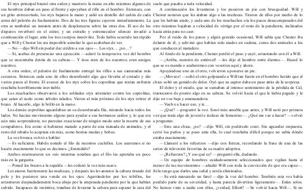 El dolor y el miedo, que se sumaban al intenso sentimiento de la pérdida de Cal, trastocaron de pronto algo en su cabeza. Se volvió hacia el que le había pegado y le dijo en voz baja y amenazadora:— Vuelve a hacer eso, y te …—¿ Qué?— preguntó la voz. Sonó más amable que antes, y Will notó por primera vez que tenía algo de juvenil e incluso de femenino—. ¿ Qué me vas a hacer?— volvió a preguntar.