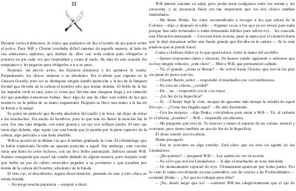 — Me llamo Drake. No estoy acostumbrado a recoger a los que echan de la Colonia— dijo, y después se calló—. Algunas veces a los que ya no sirven para nada porque han sido torturados o están demasiado débiles para sobrevivir … les concedo una liberación anticipada.— Con una triste sonrisa, pasó la mano por el cinturón hasta que la dejó descansar sobre una funda grande que llevaba en la cadera—. Es lo más piadoso que se puede hacer. Como si hubiera dicho ya lo que quería decir, retiró la mano del cuchillo.— Quiero respuestas claras y sinceras. Os hemos estado siguiendo y sabemos que no hay ningún refuerzo, ¿ está claro?— Miró a Will, que permaneció callado.— Tú, el grande, ¿ cómo te llamas?— Se volvió hacia Chester, que movía los pies sin parar de puros nervios.— Chester Rawls, señor— respondió el muchacho con voz temblorosa.— No eres un colono, ¿ verdad?— Eh … no— respondió con la voz ronca.—¿ Un Ser de la Superficie?— Sí.— Chester bajó la vista, incapaz de aguantar más tiempo la mirada de aquel frío ojo—. ¿ Cómo has llegado aquí?— He sido desterrado.— Con los mejores— dijo Drake, volviéndose para mirar a Will—. Tú, el valiente