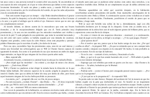 Pero sus ojos, escondidos bajo las prominentes cejas, eran de un azul intenso y tenían una ferocidad tan sobrecogedora que ni Will ni Chester fueron capaces de aguantarle la mirada. Era como si lo profundo de sus ojos mostrara un atisbo de algún lugar aterrador, un lugar del que ninguno de los chicos quería saber nada.— Bien, esperad allá. Arrastrando los pies, comenzaron a caminar hacia la sala que les indicaba Drake.—¡ Pero dejad aquí las mochilas!— les ordenó y, sin dejar de mirar a los chicos, preguntó—: ¿ Todo bien, Elliott?