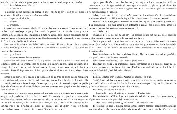 «¡ Por favor, por favor, por favor!», imploró. A continuación, los Limitadores volvieron a hablar:— El Ser de la Superficie— decía uno—. Lo encontraremos …