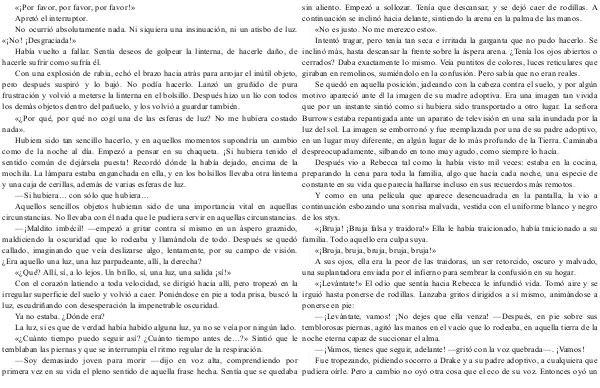 —¡ Maldito imbécil!— empezó a gritar contra sí mismo en un áspero graznido, maldiciendo la oscuridad que lo rodeaba y llamándola de todo. Después se quedó callado, imaginando que veía deslizarse algo, lentamente, por su campo de visión. ¿ Era aquello una luz, una luz parpadeante, allí, la derecha? «¿ Qué? Allí, sí, a lo lejos. Un brillo, sí, una luz, una salida ¡ sí!» Con el corazón latiendo a toda velocidad, se dirigió hacia allí, pero tropezó en la irregular superficie del suelo y volvió a caer. Poniéndose en pie a toda prisa, buscó la luz, escudriñando con desesperación la impenetrable oscuridad. Ya no estaba. ¿ Dónde era? La luz, si es que de verdad había habido alguna luz, ya no se veía por ningún lado. «¿ Cuánto tiempo puedo seguir así? ¿ Cuánto tiempo antes de …?» Sintió que le temblaban las piernas y que se interrumpía el ritmo regular de la respiración.— Soy demasiado joven para morir— dijo en voz alta, comprendiendo por primera vez en su vida el pleno sentido de aquella frase hecha. Sentía que se quedaba