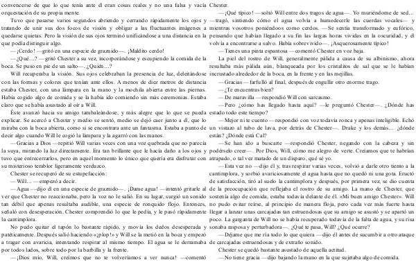 —¡ Qué típico!— soltó Will entre dos tragos de agua—. Yo muriéndome de sed …— tragó, sintiendo cómo el agua volvía a humedecerle las cuerdas vocales— y mientras vosotros poniéndoos como cerdos.— Se sentía transformado y eufórico, pensando que habían llegado a su fin las largas horas vividas en la oscuridad, y él volvía a encontrarse a salvo. Había sobrevivido—. ¡ Asquerosamente típico!— Tienes una pinta espantosa— comentó Chester en voz baja. La piel del rostro de Will, generalmente pálida a causa de su albinismo, ahora resultaba más pálida aún, blanqueada por los cristalitos de sal que se le habían incrustado alrededor de la boca, en la frente y en las mejillas.— Gracias— farfulló al final, después de engullir otro enorme trago.—¿ Te encuentras bien?— De maravilla— respondió Will con sarcasmo.— Pero ¿ cómo has llegado hasta aquí?— le preguntó Chester—. ¿ Dónde has estado todo este tiempo?