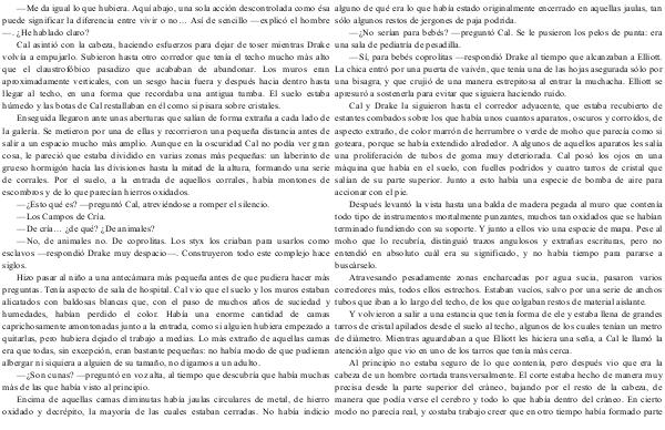Después levantó la vista hasta una balda de madera pegada al muro que contenía todo tipo de instrumentos mortalmente punzantes, muchos tan oxidados que se habían terminado fundiendo con su soporte. Y junto a ellos vio una especie de mapa. Pese al moho que lo recubría, distinguió trazos angulosos y extrañas escrituras, pero no entendió en absoluto cuál era su significado, y no había tiempo para pararse a buscárselo.