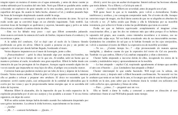 — Lo han atrapado— explicó Cal, respirando aguadamente al tiempo que azotaba el aire con el bastón—. ¡ Los Limitadores han atrapado a Drake!
