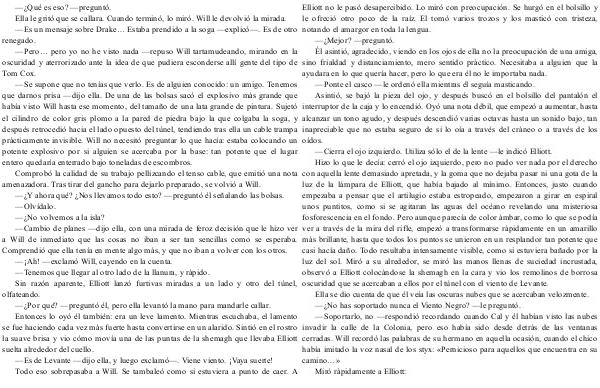 Elliott no le pasó desapercibido. Lo miró con preocupación. Se hurgó en el bolsillo y le ofreció otro poco de la raíz. El tomó varios trozos y los masticó con tristeza, notando el amargor en toda la lengua.—¿ Mejor?— preguntó. Él asintió, agradecido, viendo en los ojos de ella no la preocupación de una amiga, sino frialdad y distanciamiento, mero sentido práctico. Necesitaba a alguien que la ayudara en lo que quería hacer, pero lo que era él no le importaba nada.— Ponte el casco— le ordenó ella mientras él seguía masticando. Asintió, se bajó la pieza del ojo, y después buscó en el bolsillo del pantalón el interruptor de la caja y lo encendió. Oyó una nota débil, que empezó a aumentar, hasta alcanzar un tono agudo, y después descendió varias octavas hasta un sonido bajo, tan inapreciable que no estaba seguro de si lo oía a través del cráneo o a través de los oídos.— Cierra el ojo izquierdo. Utiliza sólo el de la lente— le indicó Elliott. Hizo lo que le decía: cerró el ojo izquierdo, pero no pudo ver nada por el derecho con aquella lente demasiado apretada, y la goma que no dejaba pasar ni una gota de la luz de la lámpara de Elliott, que había bajado al mínimo. Entonces, justo cuando empezaba a pensar que el artilugio estaba estropeado, empezaron a girar en espiral unos puntitos, como si se agitaran las aguas del océano revelando una misteriosa fosforescencia en el fondo. Pero aunque parecía de color ámbar, como lo que se podía ver a través de la mira del rifle, empezó a transformarse rápidamente en un amarillo más brillante, hasta que todos los puntos se unieron en un resplandor tan potente que casi hacía daño. Todo resultaba intensamente visible, como si estuviera bañado por la luz del sol. Miró a su alrededor, se miró las manos llenas de suciedad incrustada, observó a Elliott colocándose la shemagh en la cara y vio los remolinos de borrosa oscuridad que se acercaban a ellos por el túnel con el viento de Levante. Ella se dio cuenta de que él veía las oscuras nubes que se acercaban velozmente.—¿ No has soportado nunca el Viento Negro?— le preguntó.— Soportarlo, no— respondió recordando cuando Cal y él habían visto las nubes invadir la calle de la Colonia, pero eso había sido desde detrás de las ventanas cerradas. Will recordó las palabras de su hermano en aquella ocasión, cuando el chico había imitado la voz nasal de los styx: « Pernicioso para aquellos que encuentra en su camino …»