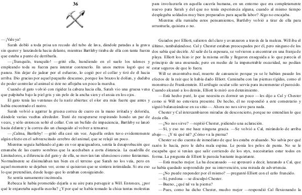 — Está mucho mejor. La ha descansado— se apresuró a decir, lanzando a Cal, que se había quedado sorprendido por su intervención, una mirada de advertencia.—¿ No puede responder por él mismo?— preguntó Elliott con el ceño fruncido.— Sí, perdona— se disculpó Chester.— Bueno, ¿ qué tal va la pierna?— Pues, como ha dicho Chester, mucho mejor— respondió Cal flexionando la