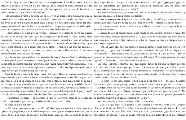—¡ El Sol! ¡ Es mi viejo amigo el Sol, que aparece otra vez!— exclamó el doctor Burrows—. ¡ Qué burro que soy, pero si eres igual que el que está pintado en el techo!— La esfera estaba metida en una de las esquinas, y sus rayos en punta se extendían por el resto del relieve—. Ahora, veamos: ¿ qué es lo que me quieres contar? ¿ Me estás mostrando el lugar al que aquella figura mosaica llevará a la gente? ¿ Se trata de un enorme peregrinaje hacia la Superficie? ¿ Es eso? Volvió a mirar el primer panel que había examinado.—¿ Un jefe que lleva a su pueblo a una especie de nirvana ideal, a los Campos Elíseos, al Jardín del Edén?— Volvió a mirar el panel que tenía delante—. Pero me estás mostrando la superficie de la Tierra y el Sol … y entonces, ¿ qué hace aquí, tan por debajo de esa superficie, un relieve tan bonito como éste? ¿ Eres un recordatorio