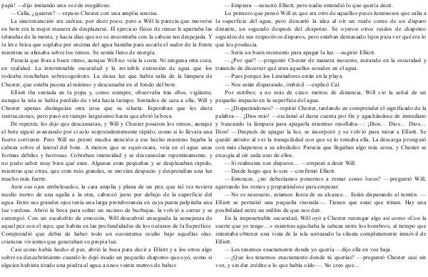 papá!— dijo imitando una voz de megáfono.— Calla, ¿ quieres?— repuso Chester con una amplia sonrisa. La sincronización era caótica, por decir poco, pero a Will le parecía que moverse en bote era la mejor manera de desplazarse. El ejercicio físico de remar le apartaba las telarañas de la mente, y hacía días que no se encontraba con la cabeza tan despejada. Y la leve brisa que soplaba por encima del agua bastaba para secarle el sudor de la frente mientras se afanaba sobre los remos. Se sentía lleno de energía.