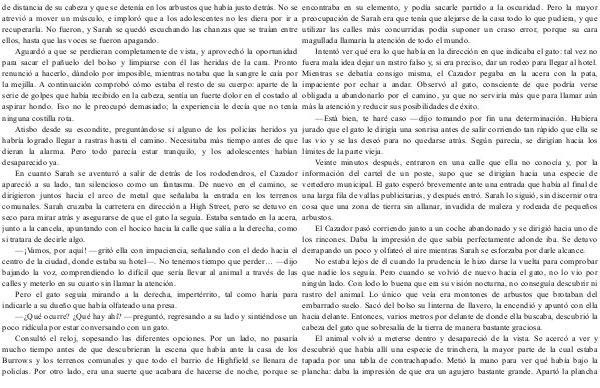 Intentó ver qué era lo que había en la dirección en que indicaba el gato: tal vez no fuera mala idea dejar un rastro falso y, si era preciso, dar un rodeo para llegar al hotel. Mientras se debatía consigo misma, el Cazador pegaba en la acera con la pata, impaciente por echar a andar. Observó al gato, consciente de que podría verse obligada a abandonarlo por el camino, ya que no serviría más que para llamar aún más la atención y reducir sus posibilidades de éxito.