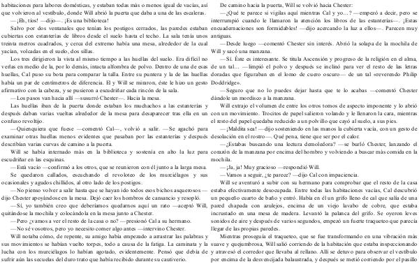 —¿ Estabas buscando una lectura demoledora?— se burló Chester, lanzando el corazón de la manzana por encima del hombro y volviendo a buscar más comida en la mochila.—¡ Ja, ja! Muy gracioso— respondió Will.— Vamos a seguir, ¿ te parece?— dijo Cal con impaciencia. Will se aventuró a subir con su hermano para comprobar que el resto de la casa estaba efectivamente desocupada. Entre todas las habitaciones vacías, Cal descubrió un pequeño cuarto de baño y entró. Había en él un grifo lleno de cal que salía de una pared chapada con azulejos, encima de un viejo lavabo de cobre, que estaba incrustado en una mesa de madera. Levantó la palanca del grifo. Se oyeron leves sonidos de aire y después de varios segundos, empezó un fuerte traqueteo que parecía llegar de las propias paredes.