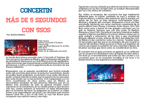 El concierto fue un gran concierto en general, yo lo calificaría con un 10 pero el soundcheck como un 8 pues les falto ánimo. Sin duda yo si recomendaría que todas las fans asistan a sus conciertos pues es un momento increíble al ver tocar a tu banda favorita y una experiencia inolvidable.