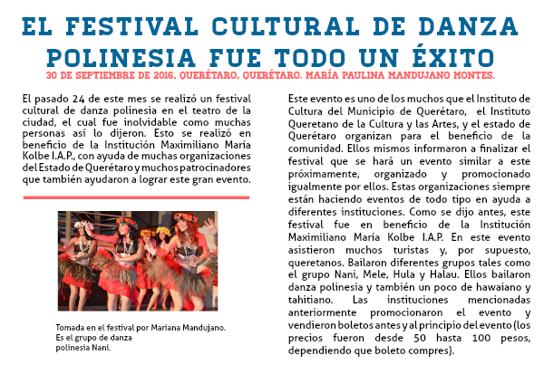 El pasado 24 de este mes se realizó un festival cultural de danza polinesia en el teatro de la ciudad, el cual fue inolvidable como muchas personas así lo dijeron. Esto se realizó en beneficio de la Institución Maximiliano María Kolbe I.A.P., con ayuda de muchas organizaciones del Estado de Querétaro y muchos patrocinadores que también ayudaron a lograr este gran evento.