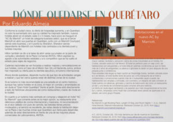 Conforme la ciudad crece, la oferta de hospedaje aumenta, y en Querétaro no solo ha aumentado sino que su calidad ha mejorado también, nuevos hoteles abren en el estado cada 3 o 4 meses, hace poco se inauguró el “AC By Marriott” un hotel de categoría business select, que es el tercer Marriott en abrir sus puertas en Querétaro, junto con un Marriott Courtyard, siendo este business, y el 4 points by Sheraton, Sheraton siendo dependiente de Marriott con hoteles más centrados a la clientela joven y turistas mayores.