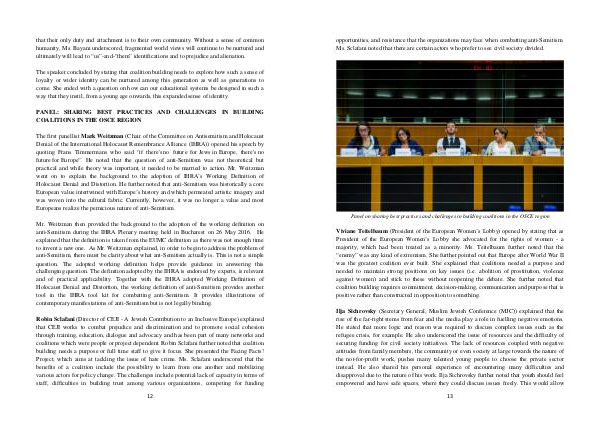 Robin Sclafani( Director of CEJI- A Jewish Contribution to an Inclusive Europe) explained that CEJI works to combat prejudice and discrimination and to promote social cohesion through training, education, dialogue and advocacy and has been part of many networks and coalitions which were people or project dependent. Robin Sclafani further noted that coalition building needs a purpose or full time staff to give it focus. She presented the Facing Facts! Project, which aims at tackling the issue of hate crime. Ms. Sclafani underscored that the benefits of a coalition include the possibility to learn from one another and mobilizing various actors for policy change. The challenges include potential lack of capacity in terms of staff, difficulties in building trust among various organizations, competing for funding