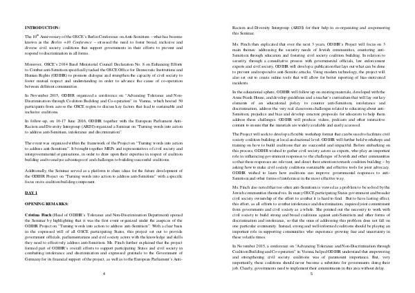 In November 2015, a conference on“ Advancing Tolerance and Non-Discrimination through Coalition Building and Co-operation” in Vienna, helped ODIHR understand that empowering and strengthening civil society coalitions was of paramount importance. But, very importantly, these coalitions should never become a substitute for governments doing their job. Clearly, governments need to implement their commitments in this area without delay. 5