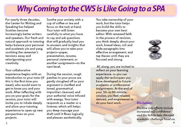 All along, you are invited to reflect on your learning experience, so you can apply the techniques you have developed to future academic or professional assignments. At the end of your 30- or 60-minute session, you feel relaxed, revived, and empowered to do your best work.