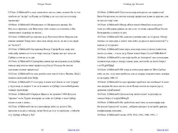 10:30am @ Mishoni54 Светом владају интереси а не пријатељи! Било би прелепо да светом владају пријатељи једни са другим, али на жалост није тако. 10:35am @ Mishoni54 Имају иРуси такав " обичај " као и ми, само тамо је озбиљнија држава па зна се ко то може даради! Када би ми билидржава у смислу те реч 10:37am @ Mishoni54 Но, нашли су начина како да то ураде. Остаје питање од мил. евра а зашто тако неће да ураде и нама помогну!? а некада су то урадил 10:39am @ Mishoni54 има пара, има пара само у овоме лежи пола онога са слике... а веле да је Руски човек! https:// t. co / nVHBoKrhvV 10:40am @ Mishoni54 а ове који треба да " испоруче " оне легендарне хеликоптере који се чекају годину дана, могли би да палте https:// t. co / YLg60XjhgI 10:42am @ Mishoni54 ИСтоија је учитељица живота! Што Србљи неће да уче, то је наш проблем, али се морају утврдити неке лекције из историје 1806-13 10:44am @ Mishoni54 и сада правимо проблем око плаћања! А само ова двојица би пола посла у вези Русије могли да одраде јер су државни службеници! 10:47am @ Mishoni54 Да на истоку нешто ново! за разлику од запада! https:// t. co / jykc9BhvqD 10:49am @ Mishoni54 Не треба баш тако! има ту новотарија које би ваљало " преузети " од њих... добровољни рад за потребе државе, конфискација имовине.. 10:50am @ Mishoni54 затим 1878, 1914, 1941, 1948, 1991...!