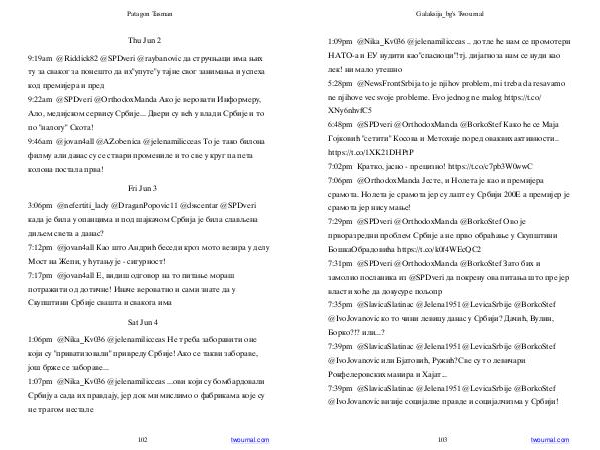 3:06pm @ nefertiti _ lady @ DraganPopovic11 @ dsscentar @ SPDveri када је била у опанцима и под шајкачом Србија је била слављена диљем света а данас? 7:12pm @ jovan4all Као што Андрић беседи кроз мото везира у делу Мост на Жепи, у ћутању је- сигурност! 7:17pm @ jovan4all Е, видиш одговор на то питање мораш потражити од дотичне! Иначе вероватно и сами знате да у Скупштини Србије свашта и свакога има