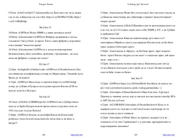 5:22pm @ SPDveri https:// t. co / XOAsrHi4A4 Ima Kinez da nam se sto pre vrati u petodnevnu posetu, posle ovakog gurmanluka:-) 6:19pm @ istorijska @ DusanStankovic4 Није баш тако. Уругвај и Прагвај су типичне земље које су настале као неутралне између БРА и АРГ. Од нас су бољи 6:21pm @ GUBERINI @ istorijska @ DusanStankovic4 Боље и та варијанте, него да ти једна од тих " сила " мазне територију па ти после тражи да јој се извинеш 6:23pm @ istorijska @ INinic Било, па прошло, надајмо се и не- поновило се! са тим " грађанским " а у суштини, преварантским и корумпираним ликовима!