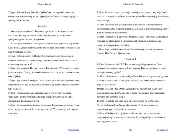 9:32am @ stamenkovic23 Е! Такви нам и требају, који се не баве историјом као политиком већ као науком. Које то установе и зашто не дају архивску грађу? 10:35am @ demosserbos @ srpski _ radikali На жалост " увалили " су нам и патку и патка, зато смо сада у оваквој бари омиљеном станишту тате и маме патка! 4:02pm @ DejanFpzg Остаје сенка на том " позиву " јер је уследио после напада наСССР а требао је бити пре напада због усташких злочина над Србима у Хрв 4:30pm @ Krle22 ова вест није ни мало добра по Србе јер се без потребно међусобно конфротирају. А онда се однекуд појави " помиритељ " који ће их мирити 6:42pm @ NebojsaMedojevi може бити да је тако, али светска ситуација се променила у последњих 5 год. Вучић је то осетио па сада врда око тога!