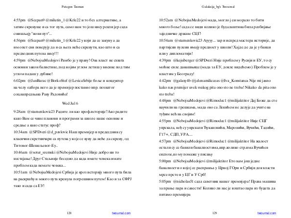 10:52am @ NebojsaMedojevi мада, могло ј еи морало то бити много боље! сада се види колико је будалаштина била разбијање заједничке државе СЦГ! 10:54am @ stamenkovic23 Ауууу... зар и испред мастера историје, да партијски пулени имају предност у школи! Хајде де да је у банци или у дипломатији! 4:39pm @ kejsiberger @ SPDveri Није проблем у Русији и ЕУ, то су моћне силе данашњице( мада за ЕУ, докле видећемо) Проблем је у властим у Београду! 4:42pm @ galaxy4b @ jelenamilicceas @ Iva _ Konstanca Nije mi jasno kako nas premijer uvek svakog pita ono sto ne treba! Nikako da pita ono sto treba! 4:48pm @ NebojsaMedojevi @ Rimodec1 @ milijaktitor Дај Боже да сте научили на грешкама, мада ово са Лекићем не делује да учите на туђим већ на својим! 4:55pm @ NebojsaMedojevi @ Rimodec1 @ milijaktitor Није СЦГ упрскала, веђ су упрскали Ђукановићи, Маровићи, Вучићи, Тадићи, Г17 +, СДП, УРА.... 4:57pm @ NebojsaMedojevi @ Rimodec1 @ milijaktitor На жалост остали су се бавили баналностима, нпр. колико стр. има Вучићев експозе, ко му помаже у писању 5:00pm @ NebojsaMedojevi @ milijaktitor Ето вам још једне баналности о којој се расправља у Црној ГОри и Србији док власти мрсе прсте и у ЦГ и У Срб! 5:05pm @ nicholas51 сада саветник нашег премијера! Права машина за прање пара и савести! Колико ли нас је коштао пара из буџета да питамо премијера