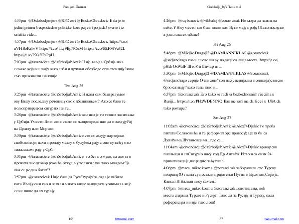 3:25pm @ tatanadete @ drSrboljubAntic Нисам сам баш разумео ову Вашу последњу реченицу око одбацивањем? Ако се бавите пољопривредом сигурно занте.. 3:28pm @ tatanadete @ drSrboljubAntic колико је то тешко занимање у Србији. Уместо Ви и сви остали пољопривредници да поседујуРај на Дунаву или Морави 3:30pm @ tatanadete @ drSrboljubAntic исте поседују партијски снобови који нама продају маглу о будућем рају а они су већ у ово земаљском рају у Срб. 3:31pm @ tatanadete @ drSrboljubAntic и то без по муке, па ако сте прочитали одговор ружића откуд му толики стан тако младом:" ја сам се родио богат "! 3:52pm @ zorancicak Није баш да Руси " гурају " за сада још било кога. Имају они као и остали много више кандидата уонима за које се не пише да их гурају