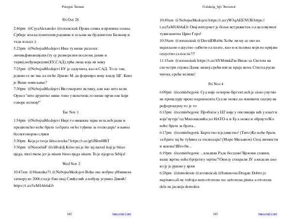 2:46pm @ CyyzAlexander @ zorancicak Права слика и прилика земље Србије земље поштених радника и сељака на брдовитом Балкану и тада и сада:) 5:23pm @ NebojsaMedojevi Има ту више разлога: лични, финансијски( ту су разноразни послови, јавни и тајни), међународни( ЕУ, САД), трћа лица која их вежу 7:25pm @ NebojsaMedojevi ЕУ је одлучила, као и САД. То се зна, једино се не зна да ли ће Душко М. да формира нову владу ЦГ. Како је Ваше мишљење? 7:30pm @ NebojsaMedojevi Ви говорите истину, али као што вели Орвел " што друштво више тоне у неистине, то више мрзи оне kojи говоре истину!"