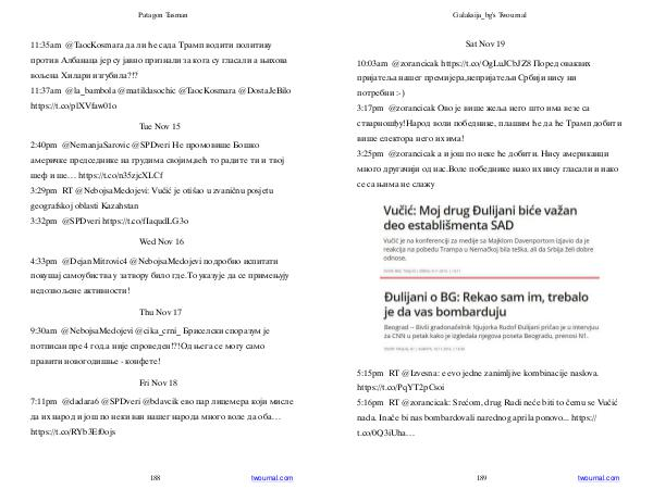2:40pm @ NemanjaSarovic @ SPDveri Не промовише Бошко америчке председнике на грудима својим, већ то радите ти и твој шеф и ше … https:// t. co / n35zjcXLCf 3:29pm RT @ NebojsaMedojevi: Vučić je otišao u zvaničnu posjetu geografskoj oblasti Kazahstan 3:32pm @ SPDveri https:// t. co / fIaqudLG3o