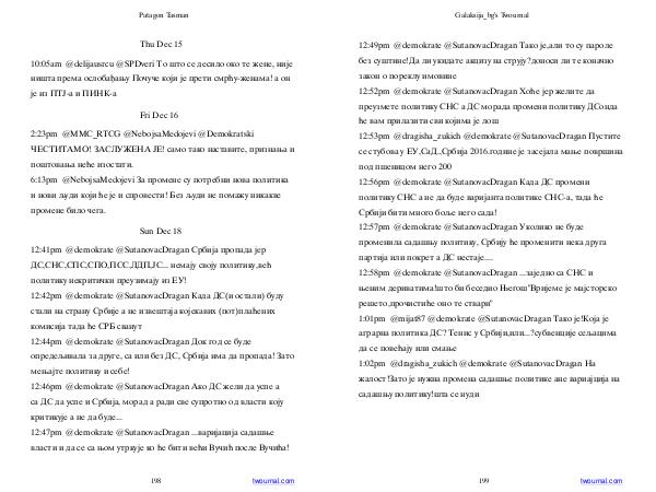 12:41pm @ demokrate @ SutanovacDragan Србија пропада јер ДС, СНС, СПС, СПО, ПСС, ЛДП, ЈС... немају своју политику, већ политику некритички преузимају из ЕУ! 12:42pm @ demokrate @ SutanovacDragan Када ДС( и остали) буду стали на страну Србије а не извештаја којекавих( пот) плаћених комисија тада ће СРБ сванут 12:44pm @ demokrate @ SutanovacDragan Док год се буде опредељивала за друге, са или без ДС, Србија има да пропада! Зато мењајте политику и себе! 12:46pm @ demokrate @ SutanovacDragan Ако ДС жели да успе а са ДС да успе и Србија, морад а ради све супротно од власти коју критикује а не да буде... 12:47pm @ demokrate @ SutanovacDragan... варијација садашње власти и да се са њом утркује ко ће бити већи Вучић после Вучића!