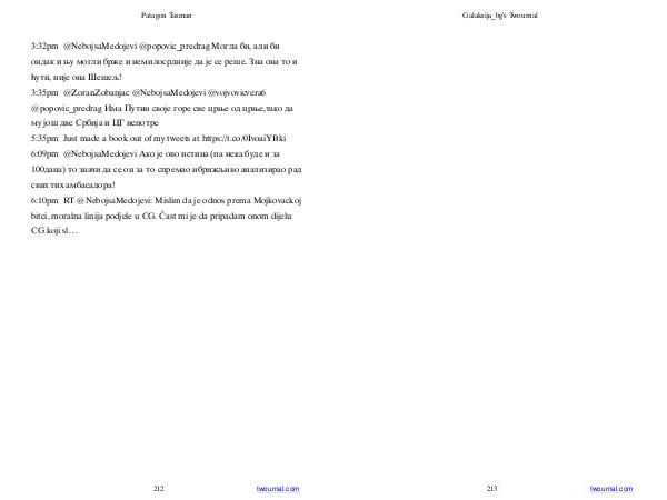 3:32pm @ NebojsaMedojevi @ popovic _ predrag Могла би, али би ондак и њу могли брже и немилосрдније да је се реше. Зна она то и ћути, није она Шешељ! 3:35pm @ ZoranZobanjac @ NebojsaMedojevi @ vojvovicvera6 @ popovic _ predrag Има Путин своје горе све црње од црње, тако да му још две Србија и ЦГ непотре 5:35pm Just made a book out of my tweets at https:// t. co / 0IvoaiYBki 6:09pm @ NebojsaMedojevi Ако је ово истина( па нека буде и за 100дана) то значи да се он за то спремао ибрижљиво анализирао рад свих тих амбасадора! 6:10pm RT @ NebojsaMedojevi: Mislim da je odnos prema Mojkovackoj bitci, moralna linija podjele u CG. Čast mi je da pripadam onom dijelu CG koji sl …