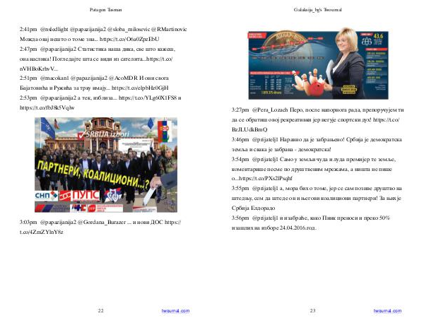 3:27pm @ Pera _ Lozach Перо, после напорнога рада, препоручујем ти да се обратиш овој рекреативки јер негује спортски дух! https:// t. co / BzJLUdkBmQ 3:46pm @ prijatelj1 Наравно да је забрањено! Србија је демократска земља и свака је забрана- демократска! 3:54pm @ prijatelj1 Само у земљи чуда и луда премијер те земље, коментарише песме по друштвеним мрежама, а ништа не пише о... https:// t. co / PXs2lPsqhf 3:55pm @ prijatelj1 а, мора бих о томе, јер се сам позиве друштво на штедњу, сем да штеде он и његови коалициони партнери! За њих је Србија Елдорадо 3:56pm @ prijatelj1 и изабраће, како Пинк преноси и преко 50 % изашлих на изборе 24.04.2016. год.