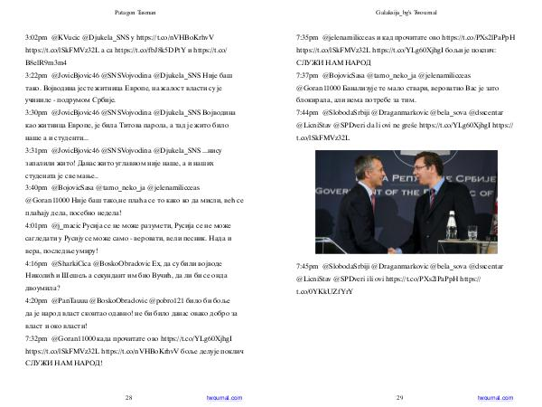 3:02pm @ KVucic @ Djukela _ SNS у https:// t. co / nVHBoKrhvV https:// t. co / lSkFMVz32L а са https:// t. co / fbJ8k5DPtY и https:// t. co / B8elR9m3m4 3:22pm @ JovicBjovic46 @ SNSVojvodina @ Djukela _ SNS Није баш тако. Војводина јесте житница Европе, на жалост власти су је учиниле- подрумом Србије. 3:30pm @ JovicBjovic46 @ SNSVojvodina @ Djukela _ SNS Војводина као житница Европе, је била Титова парола, а тад је жито било наше а и студенти... 3:31pm @ JovicBjovic46 @ SNSVojvodina @ Djukela _ SNS... нису запалили жито! Данас жито углавном није наше, а и наших студената је све мање.. 3:40pm @ BojovicSasa @ tamo _ neko _ ja @ jelenamilicceas @ Goran11000 Није баш тако, не плаћа се то како ко да мисли, већ се плаћају дела, посебно недела! 4:01pm @ j _ macic Русија се не може разумети, Русија се не може сагледати у Русију се може само- веровати, вели песник. Нада и вера, последње умиру! 4:16pm @ SharkiCica @ BoskoObradovic Ех, да су били војводе Николић и Шешељ а секундант им био Вучић, да ли би се онда двоумила? 4:20pm @ PanTauuu @ BoskoObradovic @ pobro121 било би боље да је народ власт сконтао одавно! не би било данас овако добро за власт и око власти! 7:32pm @ Goran11000 када прочитате ово https:// t. co / YLg60XjhgI https:// t. co / lSkFMVz32L https:// t. co / nVHBoKrhvV боље делује поклич СЛУЖИ НАМ НАРОД!