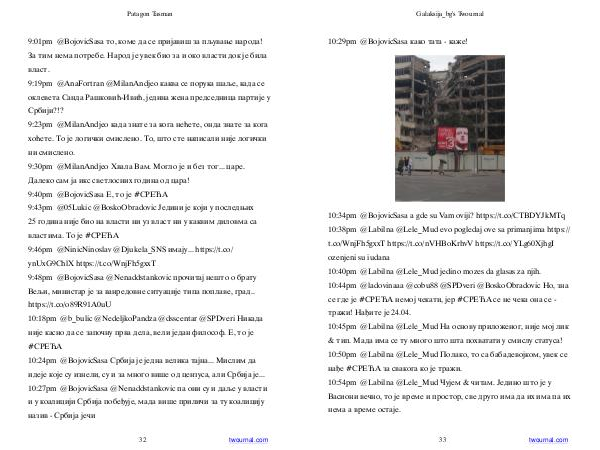 9:01pm @ BojovicSasa то, коме да се пријавиш за пљување народа! За тим нема потребе. Народ је увек био за и око власти док је била власт. 9:19pm @ AnaFortran @ MilanAndjeo каква се порука шаље, када се оклевета Санда Рашковић-Ивић, једина жена председница партије у Србији?!? 9:23pm @ MilanAndjeo када знате за кога нећете, онда знате за кога хоћете. То је логички смислено. То, што сте написали није логички ни смислено. 9:30pm @ MilanAndjeo Хвала Вам. Могло је и без тог... царе. Далеко сам ја икс светлосних година од цара! 9:40pm @ BojovicSasa Е, то је # СРЕЋА 9:43pm @ 05Lukic @ BoskoObradovic Једини је који у последњих 25 година није био на власти ни уз власт ни у каквим диловма са властима. То је # СРЕЋА 9:46pm @ NinicNinoslav @ Djukela _ SNS имају... https:// t. co / ynUxG9ChlX https:// t. co / WnjFh5gxxT 9:48pm @ BojovicSasa @ Nenaddstankovic прочитај нешто о брату Вељи, министар је за ванредовне ситуације типа поплаве, град.. https:// t. co / o89R91A0uU 10:18pm @ b _ bulic @ NedeljkoPandza @ dsscentar @ SPDveri Никада није касно да се започну прва дела, вели један философ. Е, то је # СРЕЋА 10:24pm @ BojovicSasa Србија је једна велика тајна... Мислим да идеје које су изнели, су и за много више од цензуса, али Србија је... 10:27pm @ BojovicSasa @ Nenaddstankovic па они су и даље у власти и у коалицији Србија побеђује, мада више приличи за ту коалицију назив- Србија јечи
