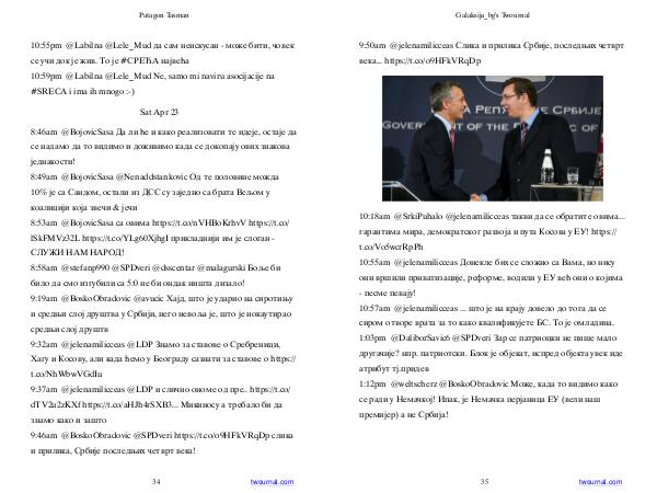 10:18am @ SrkiPuhalo @ jelenamilicceas такви да се обратите овима... гарантима мира, демократског развоја и пута Косова у ЕУ! https:// t. co / Vo5wcrRpPh 10:55am @ jelenamilicceas Донекле бих се сложио са Вама, но нису они вршили приватизације, реформе, водили у ЕУ већ они о којима- песме певају! 10:57am @ jelenamilicceas... што је на крају довело до тога да се сиром отворе врата за то како квалификујете БС. То је омладина. 1:03pm @ DaliborSavic6 @ SPDveri Зар се патриоцки не пише мало другачије? нпр. патриотски. Блок је објекат, испред објекта увек иде атрибут тј. придев 1:12pm @ weltscherz @ BoskoObradovic Може, када то видимо како се ради у Немачкој! Ипак, је Немачка перјаница ЕУ( вели наш премијер) а не Србија!