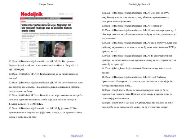 10:27am @ Bicetizao @ jelenamilicceas @ LDP Сви који од 1990 нису били у власти или уз власт, нису убијали, приватизовали, реформисали своје џепове.. 10:31am @ Bicetizao @ jelenamilicceas @ LDP Који њих? 10:36am @ Bicetizao @ jelenamilicceas @ LDP увек постоји први пут! Они који до сада нису били на власти, да буду, ако не у власти а оно у скупштини! 10:37am @ Bicetizao @ jelenamilicceas @ LDP као и обрнуто. Они који су били у скупштини и на власти да не буду ни тамо ни вамо. СРС је пример за то! 10:54am @ Bicetizao @ jelenamilicceas @ LDP To je нихилистички приступ, не може ништа да се промени, сви су исти... Скрати пут да данас буде први пут! 11:05am @ Pera _ Lozach @ raybanovic Иначе и ми одосмо- тамо далеко! 11:06am @ Bicetizao @ jelenamilicceas @ LDP... већ би било промењено. Не морамо се слагати, али околности и догађаји ће потврдити мене или тебе... 12:18pm @ raybanovic Онда, да сви ослушкујемо шта ће бити поручено из главног стана Великог вође нације и према томе да гласамо јер као што вели... 12:19pm @ raybanovic До сада је Србија, масовно гласала за вођу, сада треба да се мало то промени... да други постане судија!