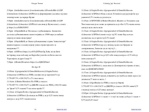 11:26am @ GogineTortice @ grognonchef @ OsmehSaStavom @ dsscentar @ SPDveri Нека се жале Уставном суду јер који ће суд уважити 0,75 гласача да је испод ц 11:29am @ SPDVERI @ BoskoObradovic Жалите се Уставном суду Чак такав какв је не може да прихвати да је због 0,75 гласача испод цензуса цела листа испо 11:32am @ GogineTortice @ grognonchef @ OsmehSaStavom @ dsscentar @ SPDveri какав год је тај УС може бар да изда саопштење да се врати тај 0,75 гласач! 11:32am @ GogineTortice @ grognonchef @ OsmehSaStavom @ dsscentar @ SPDveri јер су у питању људи а не бројеви за заокруживање. Замисли да си тиј тај 1... 11:33am @ GogineTortice @ grognonchef @ OsmehSaStavom @ dsscentar @ SPDveri па је 0,25 тебе изнад цензуса а 0,75 тебе је испод цензуса!!! 11:36am @ GogineTortice @ grognonchef @ OsmehSaStavom @ dsscentar @ SPDveri е, онда нека се Демократске странке огласе, има ли ДЕМОКРАТИЈЕ! 11:37am @ GogineTortice @ grognonchef @ OsmehSaStavom @ dsscentar @ SPDveri вреди, покушати, суд треба да види људе а не децимале!?! нека се жале...! 11:46am @ IgorBrakus по РИК-у гласло je бирача 3.770.695 * 5 %= 188.534,75 за ДВЕРИ је гласало 188.534 значи 0,75 гласача је испод а 0,25 изнад цензуса! 12:05pm @ GogineTortice @ grognonchef @ OsmehSaStavom @ dsscentar @ SPDveri 1 гласач = 1 глас! не може да буде 1 гласач = 0,75 или 0,25 гласа!