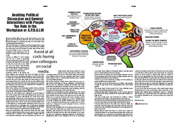 as possible when talking of Zachariah Abley’ s untimely death due to a stray bulldozer and you’ re golden. Great excuses for getting out of potentially awkward or heated conversations about the social or political climate with my colleagues that I like to use can include:“ I have to go to the stockroom.” Leaving out the wanting to hang myself from the nearest shelf.“ Let me just see if I can find that for you.” While I stare blankly at walls in said stock room contemplating who wrote what graffiti.“ I’ ve never heard of that person.” Yes. I have definitely never heard of Teresa May just please leave me alone. Smiling blankly while backing away is also a good option if you don’ t mind being considered the equal opportunities obligatory hire.“ I’ ve never really been very interested in politics …” Please don’ t look at my Twitter or Facebook. Please do not find me.“ No that must be another Hannah.” Oh god they found me. It won’ t be long before they find my # BoobsForBrexit hashtag If all else fails set fire to the staff room. Move to Tahiti. Assume the name Taconisha and work bars until the heat dies down from your inevitable shunning from not sharing the beliefs of your peers. Always keep in mind that there is a time and a place for everything. While I’ m not particularly pleased with serving the general public in a monotonous groundhog day-esque manner of pulling stock forward on shelves and putting it out, I am a big fan of having money. Most of the time, if you are having a conversation with someone that truly shares an opposing opinion to yours, trying to change their mind is a waste of time and not appropriate for the work place. The only way that you will get them to agree with you is because they want to drop the subject, but deep down you will not have changed their mind. If you are in fact lucky enough to agree with most things with the people you work with, still keep it to yourself, as you never know what the customers will think and they are the reason you get paid. To any of you that know my pain of the retail worker trying desperately not to have an aneurysm when customers or colleagues start talking about“ roblematic” issues or suddenly start turning up to work with their hair dyed blue, you have my deepest sympathies and I hope you keep your sanity like I haven’ t.