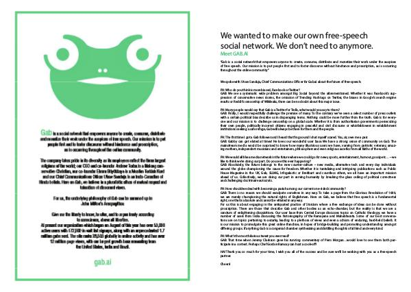 “ Gab is a social network that empowers anyone to create, consume, distribute and monetize their work under the auspices of free speech. Our mission is to put people first and to foster discourse without hindrance and proscription, as is occurring throughout the online community.”