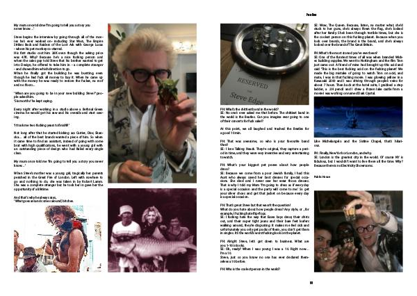 Steve begins the interview by going through all of the movies he’ s ever worked on- including Star Wars, The Empire Strikes Back and Raiders of the Lost Ark with George Lucas- where his pet monkey co-starred. His first studio cost him 28K even though the asking price was 47K. Why? Because he’ s a nice fucking person and when the sales guy told Steve that his brother wanted to get into Design, he offered to take him in- a complete stranger- and showed him which direction to go. When he finally got the building he was bursting, even though he had fuck all money to buy it. When he came up with the money he was ready to restore the fucker, no roof and no floors...