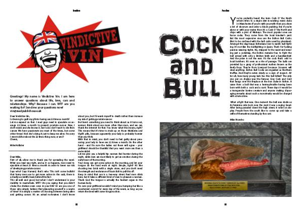 Dear Vindictive Vin, Is it wrong to guilt my gf into having sex 22 times a month? Let me expand on that. I read guys need to ejaculate on average 22 times a month to prevent prostate cancer. Now, I don ' t wank and she knows it, but I also don ' t want to die from cancer. We have passionate sex most of the times, but some other times I feel she ' s doing it just to keep me alive. I’ m sorry I even told her about the 22 times thing now; or am I? Cheers,