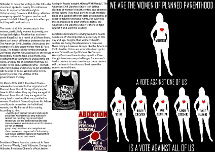 filibuster to delay the voting on this bill – she stood and spoke for nearly 12 continuous hours in support of abortion rights. Unfortunately, Governor Rick Perry called an emergency special Congress session and passed this bill. It hasn’t gone into effect yet, but they will be disastrous.