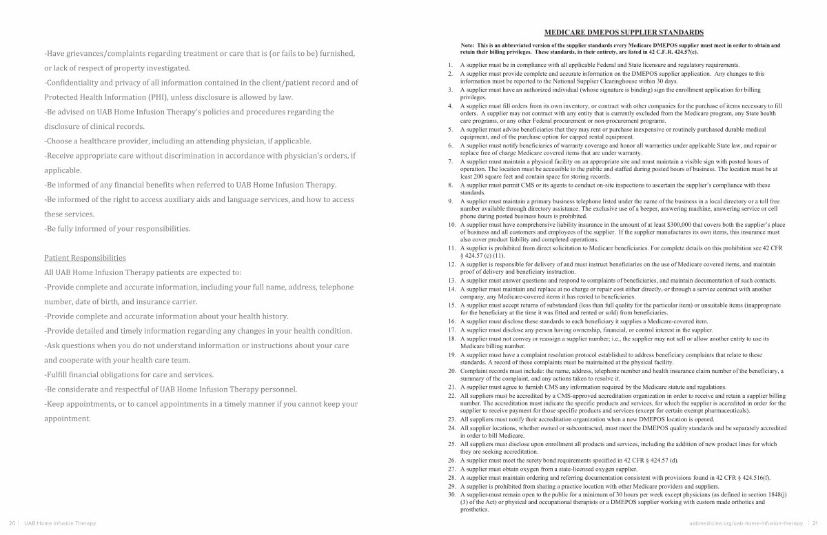 26. A supplier must meet the surety bond requirements specified in 42 CFR § 424.57( d). 27. A supplier must obtain oxygen from a state-licensed oxygen supplier. 28. A supplier must maintain ordering and referring documentation consistent with provisions found in 42 CFR § 424.516( f). 29. A supplier is prohibited from sharing a practice location with other Medicare providers and suppliers. 30. A supplier must remain open to the public for a minimum of 30 hours per week except physicians( as defined in section 1848( j)( 3) of the Act) or physical and occupational therapists or a DMEPOS supplier working with custom made orthotics and prosthetics. uabmedicine. org / uab-home-infusion-therapy 21