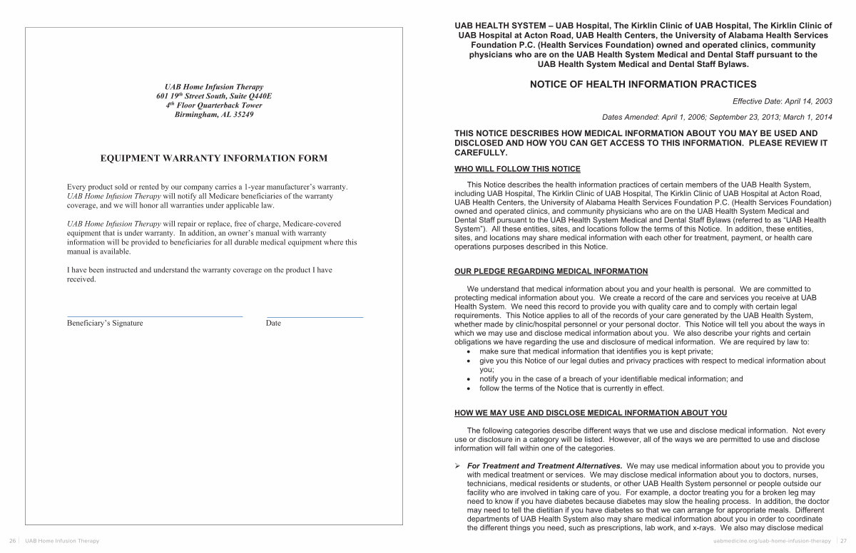 UAB Home Infusion Therapy will repair or replace, free of charge, Medicare-covered equipment that is under warranty. In addition, an owner’ s manual with warranty information will be provided to beneficiaries for all durable medical equipment where this manual is available.