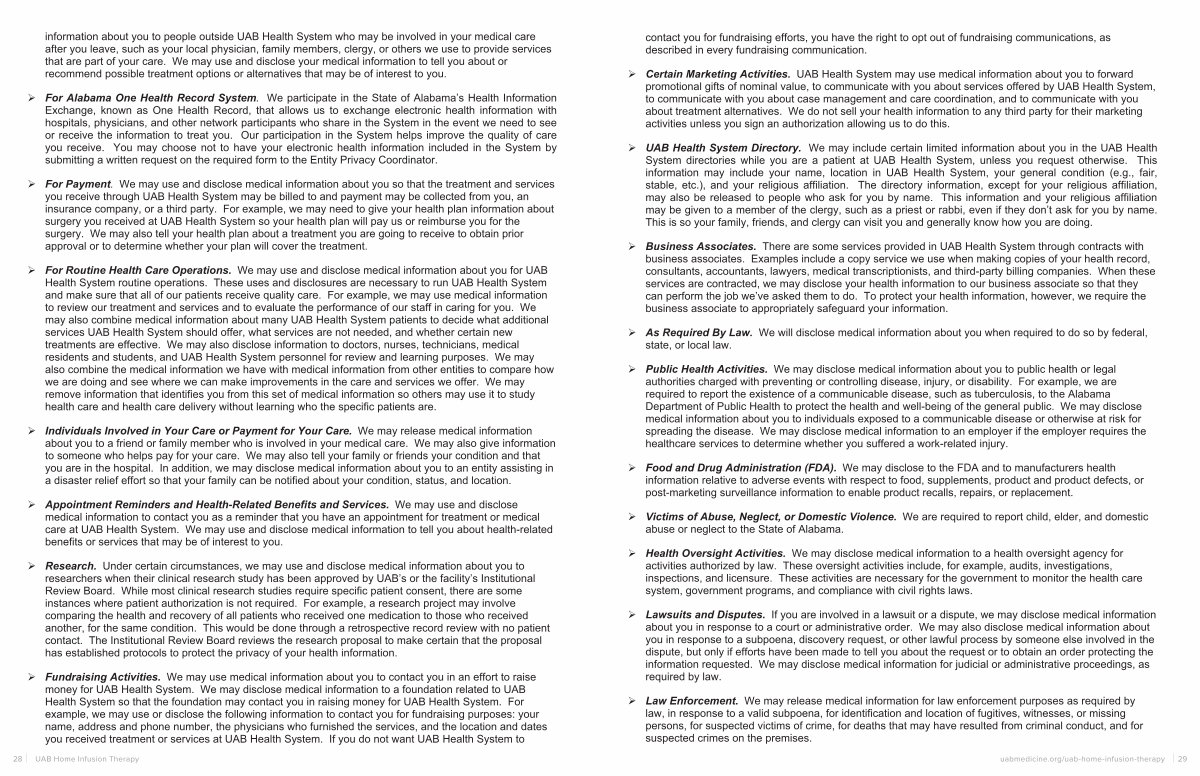 ‣ Law Enforcement. We may release medical information for law enforcement purposes as required by law, in response to a valid subpoena, for identification and location of fugitives, witnesses, or missing persons, for suspected victims of crime, for deaths that may have resulted from criminal conduct, and for suspected crimes on the premises. uabmedicine. org / uab-home-infusion-therapy 29