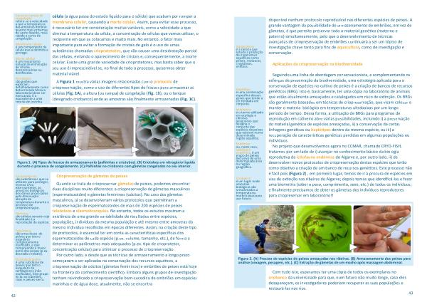 No projeto que desenvolvemos agora no CCMAR , chamado CRYO-FISH , tratamos por um lado de i ) avançar no conhecimento básico da biologia reprodutiva da ictiofauna endémica do Algarve e , por outro lado , ii ) de desenvolver novos protocolos de criopreservação destas espécies que terão como objetivo a criação de um banco de recursos genéticos . Este processo não é fácil pois ( Figura 2 ) , em primeiro lugar , temos de ir à procura de espécies em vias de extinção nas ribeiras do Algarve ; depois temos que identificá-las e fazer uma biometria ( saber o peso , comprimento , sexo , etc .) de todos os indivíduos ; e finalmente precisamos de obter os gâmetas dos indivíduos reprodutores para criopreservar em laboratório !!