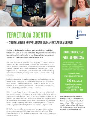 3DENT ei ole vain laboratorio , olemme kumppani , joka auttaa sinua tarjoamaan potilaillesi parasta mahdollista hoitoa . Ota yhteyttä meihin ja liity mukaan digitaalisen hammaslääketieteen tulevaisuuteen .