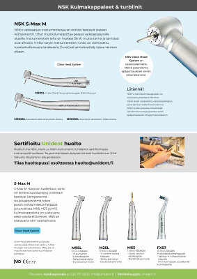 NSK : n turbiinikulmakappaleita on saatavana yleisimpiin liittimiin . Clean Head -järjestelmä, nelipistejäähdytys ja keraamiset laakerit ovat vakiona NSK : n S-Max-sarjassa . CleanHeadtakaisinimunestojärjestelmä estää epäpuhtauksien imeytymisen takaisin .