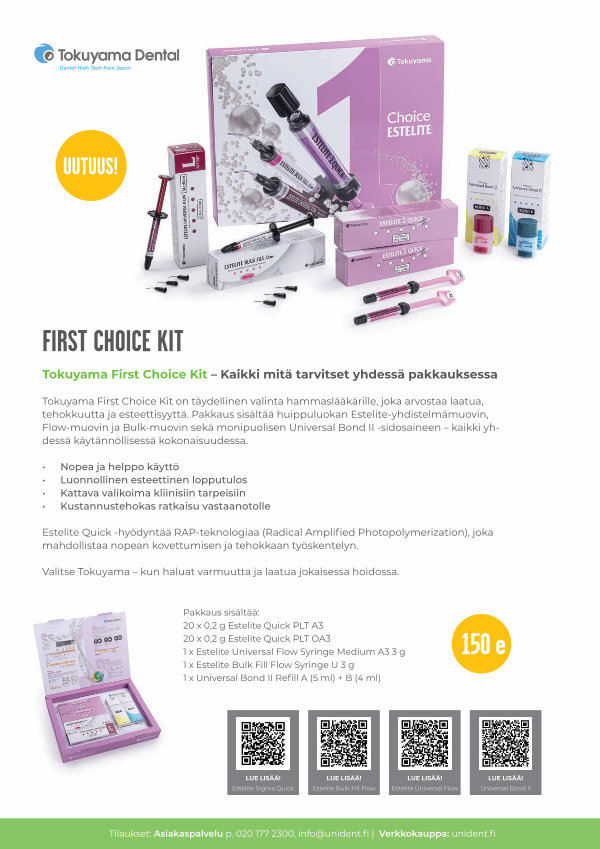 Tokuyama First Choice Kit on täydellinen valinta hammaslääkärille, joka arvostaa laatua, tehokkuutta ja esteettisyyttä. Pakkaus sisältää huippuluokan Estelite-yhdistelmämuovin, Flow-muovin ja Bulk-muovin sekä monipuolisen Universal Bond II-sidosaineen – kaikki yhdessä käytännöllisessä kokonaisuudessa.