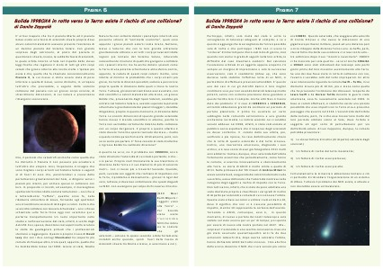 Purtroppo, infatti, solo metà del cielo è sotto la sorveglianza di telescopi adeguati al compito; e se a questo si aggiunge che la sorveglianza da Terra è possibile solo di notte e che purtroppo i NEO non ci usano la“ cortesia” di interrompere il loro cammino di giorno, cioè quando non siamo in grado di seguirli nella loro orbita, le difficoltà del caso diventano evidenti. Nel calcolare l’ evoluzione orbitale di un oggetto appena scoperto c’ è sempre un margine di imprecisione e solo le successive osservazioni, cioè il cosiddetto follow up, che sono decisive nello stabilire l’ effettiva rotta di un NEO, ci permettono di effettuare previsioni attendibili. E’ questo uno dei casi in cui gli Astrofili danno il loro miglior contributo: essi, pur non essendo dotati di telescopi molto potenti, sanno con estrema precisione dove guardare e questo facilita loro il compito. Anche altri Neo ci hanno dato dei problemi. E’ il caso di 1998XF11 e 1999AN10, entrambi abbastanza grandi da costituire un pericolo di portata planetaria. Il primo ha suscitato un certo subbuglio nella comunità astronomica e una grande eccitazione nei media. La notizia secondo cui ci sarebbe venuto addosso nel 2028, infatti, è stata comunicata al pubblico senza aspettare che il responso degli scienziati ne desse conferma. Il calcolo della sua orbita, poi, verificato a più riprese, ha reso definitivamente chiaro che la rotta di questo asteroide è del tutto innocua. Inoltre, una ricercatrice americana, sfogliando i suoi archivi, si è resa conto di aver già fotografato XF11 molti anni addietro: trattasi, dunque, di un asteroide dall’ orbita fortemente eccentrica che periodicamente, come fanno le comete, si avvicina innocuamente e silenziosamente alla Terra. La storia di AN10 è molto simile a quella di XF11. Nella primavera del’ 99 il team di Andrea Milani lo aveva avvistato ed, eseguendo dei calcoli matematici sulla sua orbita, aveva dichiarato che l’ asteroide rientrava nella categoria degli oggetti a rischio di impatto con la Terra. Non tutti sanno, infatti, che è stata da poco adottata una scala destinata proprio a classificare i vari gradi di rischio di impatto per asteroidi e comete di cui si conosce l’ orbita. Questa scala si basa sui colori e utilizza i numeri da 0 a 10, dove 0 significa che non vi è nessuna possibilità di impatto, mentre 10 rappresenta la certezza dell’ evento. Tornando a AN10, comunque, esso è, in questo momento, di nuovo a portata dei nostri telescopi e sarà visibile nel cielo ancora per un po’ di tempo; poi sparirà per essere di nuovo alla nostra portata nel 2027. Ma … sorpresa! L’ asteroide è una vecchia conoscenza. Esso era già stato osservato quarantaquattro anni fa da due astronomi tedeschi che, dopo averne calcolato l’ orbita, hanno dichiarato AN10 del tutto innocuo. Fino alla fine dello scorso decennio il NEO che ci era venuto più vicino era 1989FC. Questo asteroide, che viaggiava alla velocità di trenta Km / sec e che aveva le dimensioni di una gigantesca portaerei militare, passò ad una distanza pari a circa il doppio della distanza Terra-Luna. La beffa, però, sta nel fatto che della sua esistenza ci si rese conto solo … tre settimane dopo il suo“ incontro ravvicinato”: 1989FC ci ha mancato per sole quattro- sei ore! Anche 1996JA1 e 1996JC sono stati individuati dai telescopi solo pochi giorni prima del loro massimo avvicinamento alla Terra. Se uno dei due fosse stato in rotta di collisione con noi, l’ evento ci avrebbe colti del tutto impreparati. Un altro caso interessante riguarda la cometa Swift – Tuttle, il cui diametro misura più di 10 Km, più o meno come quella che ha provocato l’ estinzione dei dinosauri. Scoperta da Lewis Swift e da Horace Tuttle durante la guerra civile americana, essa fu nuovamente avvistata nel 1992. In base ai calcoli effettuati, si stabilì che esiste una piccola possibilità che essa impatti con la Terra al suo prossimo passaggio che avverrà nel 2126. L’ eccentricità dell’ orbita delle comete, però, fa sì che esse trascorrano molto del loro periodo orbitale vicino al Sole, dove l’ orbita è soggetta ad ogni sorta di perturbazione per via dell’ attività solare. Al suo riapparire, dunque, la cometa potrebbe presentare: